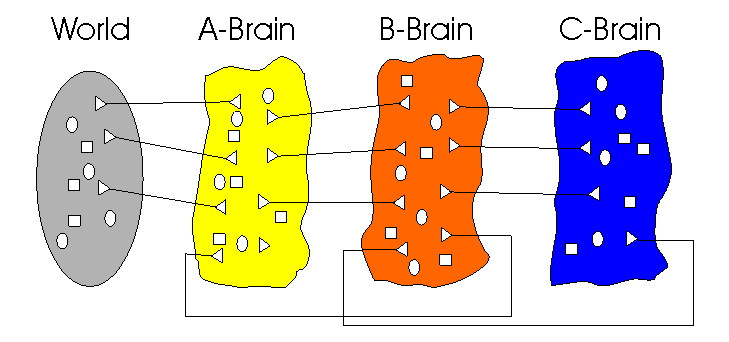 Also, I don’t think that the contents of the brains A,B,C shift or move each time that the attention is shifted. What changes is the role that each brain play in the linked structure. In the figure, the agencies of brain B now communicate with the external world, and B reports to C; C reports to a "new" D brain that wasn’t taken in account before.