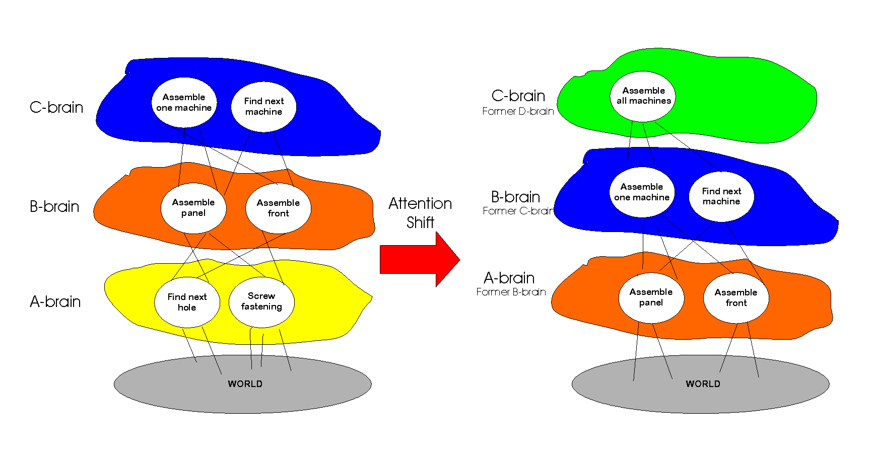 An even higher level task is to "assemble all the machines in the room". This can be managed by a D brain. If the model just allows three levels of linked brains (A,B and C), the brain can switch the attention to the brains B,C and D and change their role.