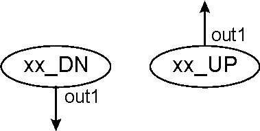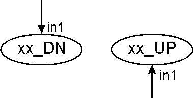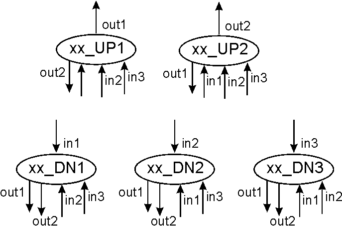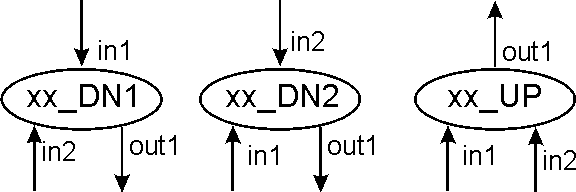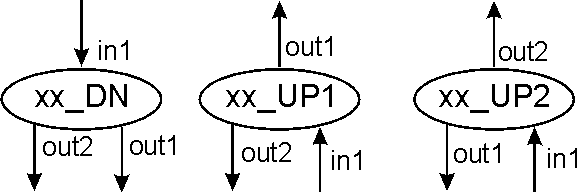 These components can be thought as "instructions" of how to assemble a topology (blocks and connections), therefore, they will be called "topology construction functions". Also, some control functions have to be introduced to help the development. They will be called "topology development functions". To standardize the representation of the multiple kinds of elements that can be present in the graph, we will introduce some conventions: Number of inputs/outputs. This depends on the type of element. It has a minimum of one input or one output, and a maximum of tree inputs and two outputs. By convention, there is a single connection at the top of the element, and this connection determines the FLOW of the element. The flow of the element is defined to be UP if the connection on top of the element is an output. The flow is then DOWN (DN) if the connection is an input. Some elements don't have FLOW, and they are located on top of all the other elements. These will be the "fixed" elements that define the inputs and outputs of the program.