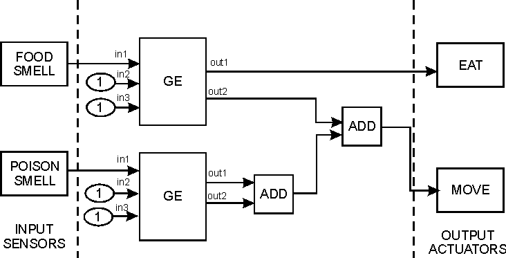 Figure 6 Cyclic graph Example Figure 6 shows one simple cyclic graph with two input sensors and two output sensors. We set up the input sensors to output a signal of "1" when they sense food or poison, and a signal less than one when they not; and we set up the actuators to move or eat when they receive an input of "1. This graph will work very badly, because the output of the "great or equal than" related with the poison smell, will always output a "1", and make the creature to move, but the creature will just "eat" if it senses food, not poison. Figure 7 Example Acyclic graph